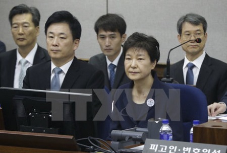 Cựu Tổng thống Hàn Quốc Park Geun-hye (phải, trước) tại Tòa án trung tâm quận Seoul ngày 23/5. (Nguồn: EPA) |