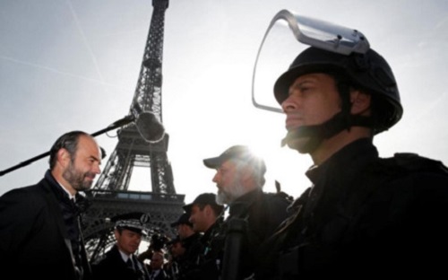Thủ tướng Pháp Edouard Philippe (trái) gặp các cảnh sát trong chuyến thăm tháp Eiffel ở Paris. (Ảnh: Reuters) |