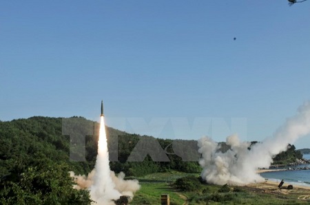 Tên lửa được phóng trong cuộc tập trận chung Mỹ-Hàn ở bờ biển phía đông Hàn Quốc ngày 5/7 vừa qua. (Ảnh: EPA/TTXVN) |