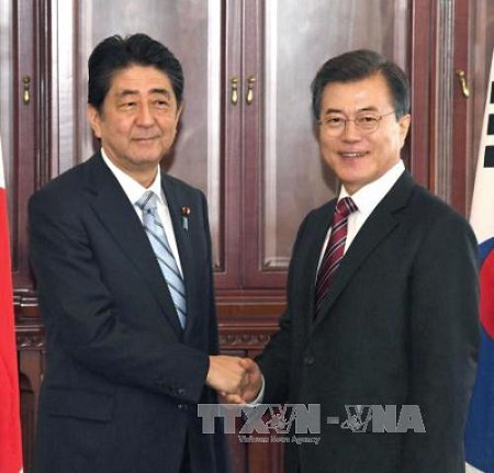 Tổng thống Hàn Quốc Moon Jae-in (phải) và Thủ tướng Nhật Bản Shizo Abe (trái). Ảnh: KYODO/TTXVN |