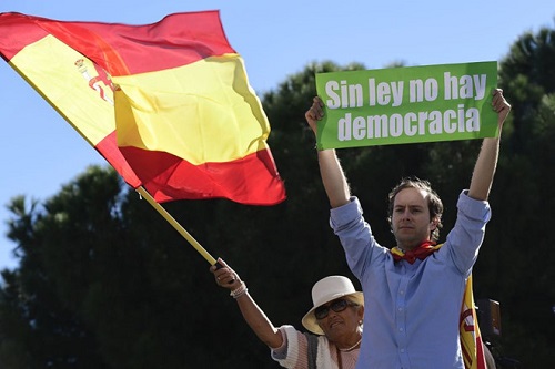 Những người biểu tình mang theo quốc kỳ Tây Ban Nha và hô to "bỏ tù Puigdemont" để bày tỏ thái độ giận dữ. Họ đứng cùng nhau trên quảng trường trung tâm, phát loa nhiều bài hát với nội dung ca ngợi Tây Ban Nha thống nhất để thể hiện tình đoàn kết.