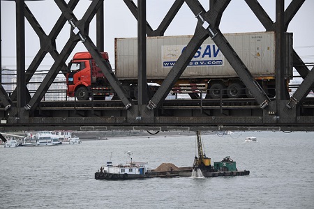 Xe tải chạy từ Triều Tiên vào Liêu Ninh, Trung Quốc, qua cầu Hữu Nghị trên sông Áp Lục. Ảnh: Getty. |