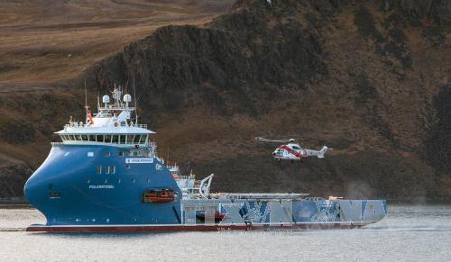 Tàu và trực thăng cứu hộ làm nhiệm vụ tại Barentsburg, Svalbard. Ảnh: AFP/TTXVN |