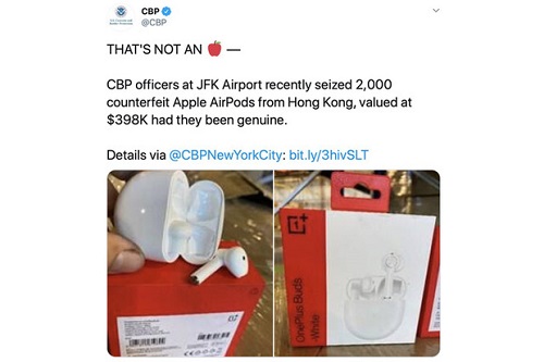 Theo thông tin được biết, Cục Hải quan và Bảo vệ Biên giới Mỹ (CBP) mới đây đã đăng tải một tuyên bố trên Twitter. Cụ thể, cơ quan này cho biết, các nhân viên của họ "vừa bắt giữ 2.000 chiếc Apple AirPods giả từ Hong Kong, có giá trị khoảng 398.000 USD trên thị trường". Các sản phẩm này xuất xứ từ Hong Kong và được thu giữ tại sân bay JFK vào ngày 31/8 vừa qua.