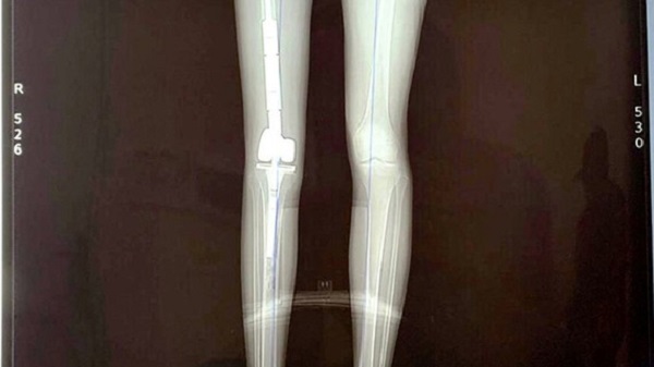 Nngày 9/3, bệnh viện K cho biết các bác sĩ Khoa Ngoại bụng 2 vừa thực hiện thành công ca đại phẫu thay toàn bộ xương đùi, bao gồm cả thay khớp háng và khớp gối toàn phần cho bệnh nhân Lê Thị H. (24 tuổi, ở Quảng Yên, Quảng Xương, Thanh Hóa) bằng xương nhân tạo. Sau ca phẫu thuật, chị H. đã trở thành người đầu tiên tại Việt Nam bước đi bằng chân có xương đùi kim loại.