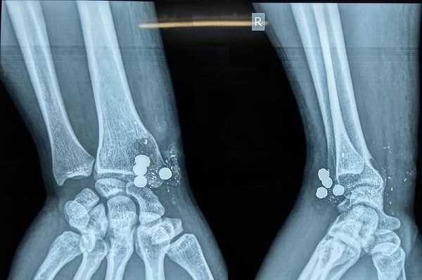 Trong cổ tay anh Th. còn 4 mảnh đạn lớn bằng chì và nhiều mảnh kim loại nhỏ khác, 1 viên lớn đã xuyên từ trước ra sau.