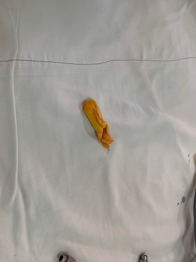 Dị vật múi mít được gắp ra khỏi đường thở của bệnh nhân |