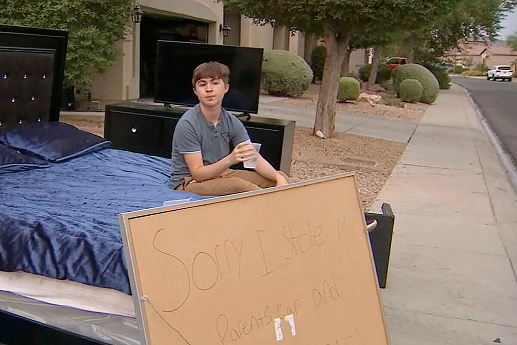 Anh Ramon và vợ đã dọn sạch đồ đạc trong phòng cậu con, đặt tất cả đồ bên đường trước nhà và bắt con ngồi trên đó như một hình phạt. Cậu bé 14 tuổi ngồi nhiều giờ trên chiếc giường của mình, dưới đất là TV, quần áo, các món đồ chơi, bên cạnh tấm biển ghi "Xin lỗi con đã lấy trộm xe của bố mẹ và chạy quá tốc độ".