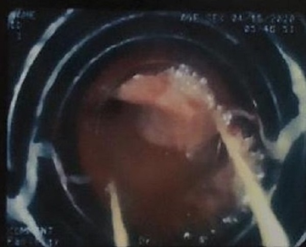 Khi huyết động của bệnh nhân đã ổn định, ê-kíp tiến hành nội soi thăm dò và đánh giá khả năng can thiệp. Đưa ống soi vào thực quản, dạ dày, các bác sĩ phát hiện bên trong có rất nhiều máu đỏ lẫn máu cục lên đến gần 1.000 ml. Thực quản có các tĩnh mạch giãn căng, ngoằn ngoèo nổi cao lên khỏi bề mặt niêm mạc, máu đang phun thành tia.