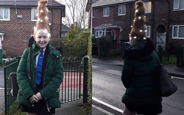 Poppy Leigh, 13 tuổi, tới trường của cô bé – Học viện Sức khỏe Manchester ở Wythenshawe, phía nam Manchester (Anh) với kiểu tóc hình cây thông Giáng sinh có cả đèn nhấp nháy.