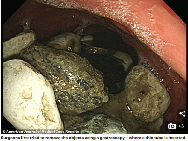 Tuy nhiên, cách này thất bại vì đá sỏi, đồng xu và nắp chai quá nhiều. Họ buộc phải phẫu thuật để lấy từng món ra ngoài.
