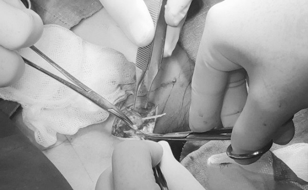 Các bác sĩ thực hiện phẫu thuật lấy xương ra khỏi cổ bệnh nhi. |