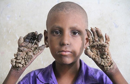 Tình trạng này khiến cơ thể cậu bé mọc đầy mụn cóc cứng có vảy. Đây là dạng rối loạn cực hiếm, khiến nhiều vùng da, thường là ở tay và chân, bị chai sần, nứt nẻ, cứng như vỏ cây.
