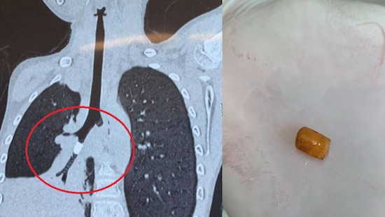 Ngay lập tức, các bác sĩ quyết định, việc soi phế quản bắt buộc phải thực hiện. Dị vật được lấy ra hết sức cẩn thận và cũng đầy thử thách, do nó nằm sâu và trơn trợt, lại kẹt bít lòng phế quản đã phù nề, viêm trợt do bị chèn ép.