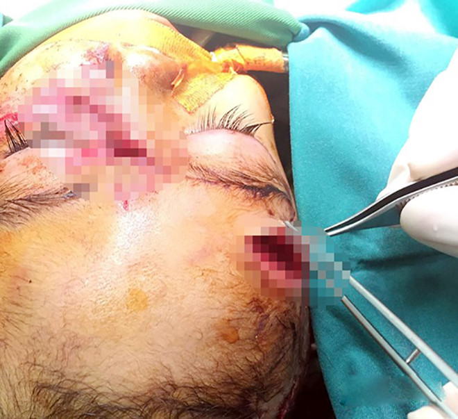 Theo các bác sĩ, vết thương của bệnh nhi rất nghiêm trọng, đặc biệt là vết thương quanh vùng mắt trái sâu, mất hết tổ chức và vết thương ở vùng trán sâu vào xương.