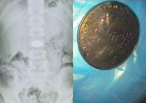Cậu bé nhanh chóng được đưa đi cấp cứu trong sự hoảng sợ của cha mẹ. Sau khi chụp chiếu, các bác sĩ phải gây mê và mổ nội soi lấy đồng xu đã trôi xuống dạ dày bé.