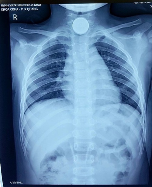 Bé được đưa tới cấp cứu tại một phòng khám tư nhân trước khi chuyển tới bệnh viện Sản - Nhi Cà Mau. Hình chụp X-quang cho thấy đồng xu mắc kẹt ở thực quản đoạn cổ - ngực.