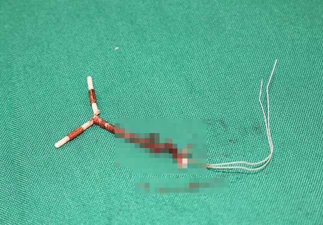 Vòng tránh thai được lấy ra khỏi ổ bụng bệnh nhân. (Ảnh: BV) |