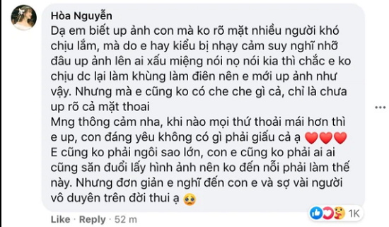 Theo đó, Hoà Minzy cho biết: "Dạ em biết up ảnh con mà không rõ mặt nhiều người khó chịu lắm, mà do em hay kiểu bị nhạy cảm suy nghĩ nhỡ đâu up ảnh lên ai xấu miệng nói nọ nói kia thì chắc em không chịu được lại làm khùng làm điên nên em mới up ảnh như vậy. Nhưng mà em cũng không có che che gì cả, chỉ là chưa up rõ cả mặt thôi".