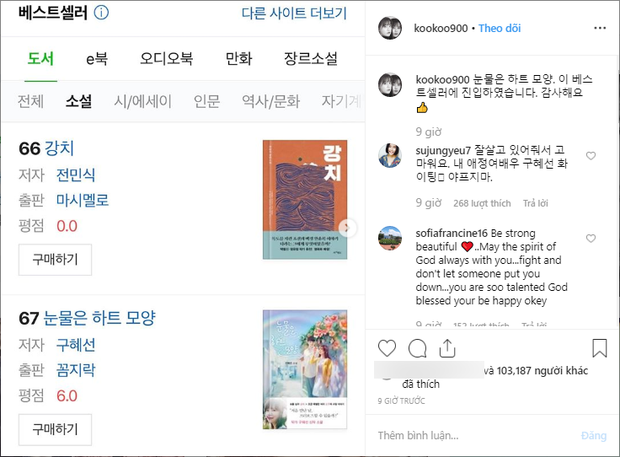 Mới đây, Goo Hye Sun đã đăng tải một bức ảnh chụp màn hình lên trang cá nhân Instagram kèm lời cảm ơn tới độc giả và fan đã ủng hộ cô trong suốt thời gian qua. Trong bức ảnh, tiểu thuyết "Nước mắt tựa trái tim" của cô lọt vào danh sách những tác phẩm bán chạy nhất tuần thứ 4 của tháng 8.