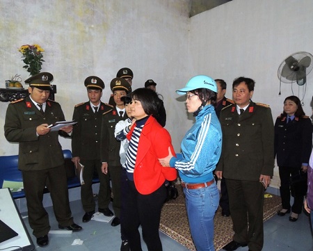 Cơ quan An ninh điều tra Công an tỉnh Hà Nam công bố lệnh bắt tạm giam và khám xét nơi ở đối với Trần Thị Nga (áo đỏ) ảnh: Công an Hà Nam |