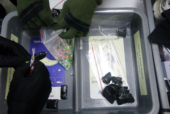 Qua kiểm tra, cơ quan chức năng phát hiện 400 viên nén màu xanh lá cây, xám, cam, xanh dương, xanh đọt chuối, hồng (nghi là ma túy tổng hợp) được giấu trong cạp quần và 2 gói bột màu trắng (nghi là ma túy), trọng lượng 24,466 gram được giấu trong quần lót của hành khách J.JA.