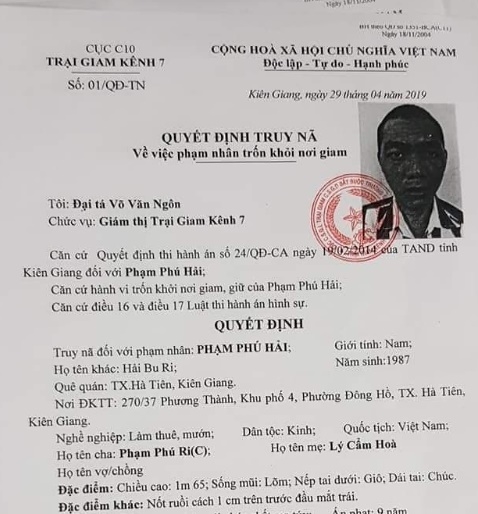 Vào lúc 13h30 phút hôm qua (29/4), phạm nhân Phạm Phú Hải, còn gọi là Hải Rubi, sinh năm 1987, quê quán thị xã Hà Tiên, tỉnh Kiên Giang nghề nghệp làm thuê làm mướn đã bỏ trốn khỏi nơi giam giữ.