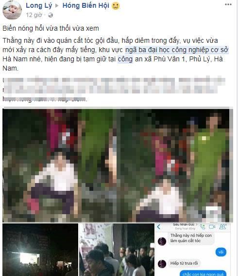 Thông tin trên báo Dân trí cho biết, mới đây, trên mạng xã hội chia sẻ thông tin một nam thanh niên được cho là đã vào một tiệm cắt tóc ở xã Phù Vân (thành phố Phủ Lý, tỉnh Hà Nam) để gội đầu. Khi nhìn thấy nữ nhân viên của tiệm ăn mặc mát mẻ, thanh niên này đã giở trò đồi bại, tuy nhiên bị nữ nhân viên phản kháng, kêu la. Nghe tiếng kêu của cô gái, người dân đã chạy đến đánh nam thanh niên rồi báo công an.