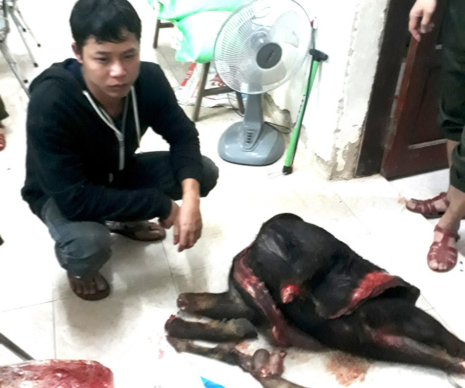 Cá thể sơn dương đã bị mổ bụng, cắt rời thành nhiều phần riêng biệt.