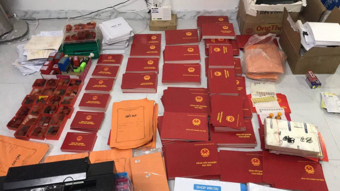 Tang vật làm giả gồm: 3.600 phôi bằng các loại (Đại học, Cao đẳng, trung cấp chuyên nghiệp, trung học phổ thông); 110 học bạ, 1.300 con dấu cao su, 1.800 miếng dán phôi các loại; 2.505 tem chống giả, 340 bảng điểm; 200 bản sao tốt nghiệp các loại, 195 văn bằng các loại.
