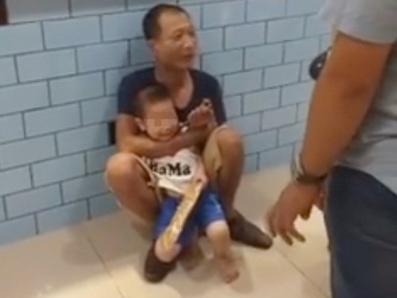 Người đàn ông có biểu hiện không tỉnh táo, dí dao vào cổ bé trai. Ảnh: Zing.vn. |