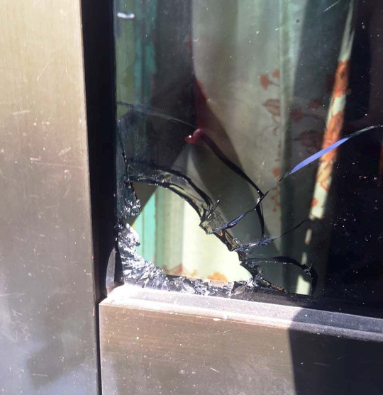 Viên đạn xuyên qua cửa kính nhà bà Thức - Ảnh: NLD |
