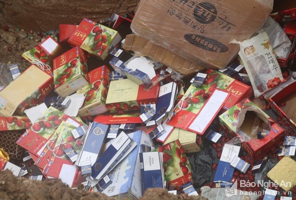 Số hàng hóa không rõ nguồn gốc bị tiêu hủy. Ảnh: Báo Nghệ An |