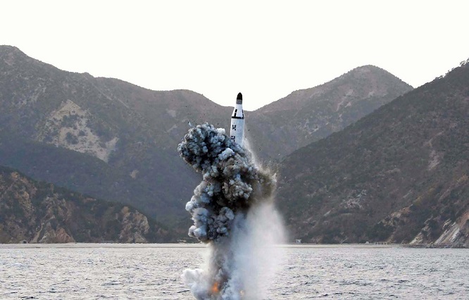 Một vụ phóng thử tên lửa đạn đạo chiến lược từ tàu ngầm ở một địa điểm bí mật của Triều Tiên ngày 23/4/2016. |