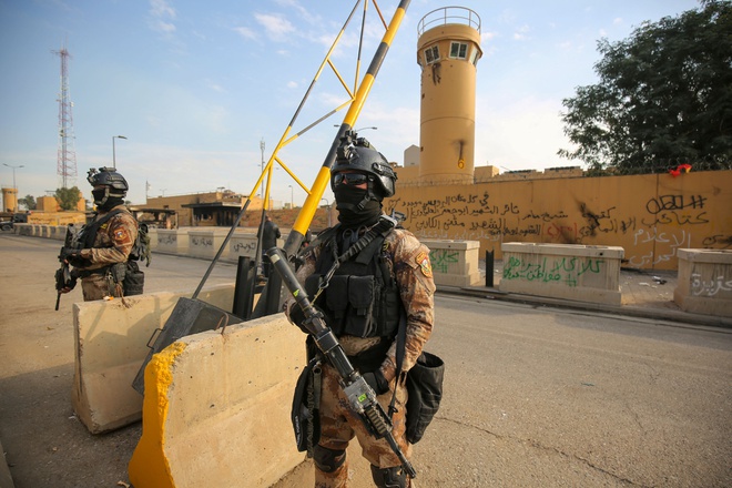 Lực lượng chống khủng bố Iraq đứng gác bên ngoài đại sứ quán Mỹ. Ảnh: Getty. |