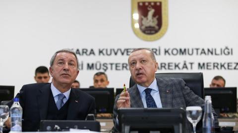 Tổng thống Thổ Nhĩ Kỳ Tayyip Erdogan và Bộ trưởng Quốc phòng Hulusi Akar (trái). Ảnh: AP |