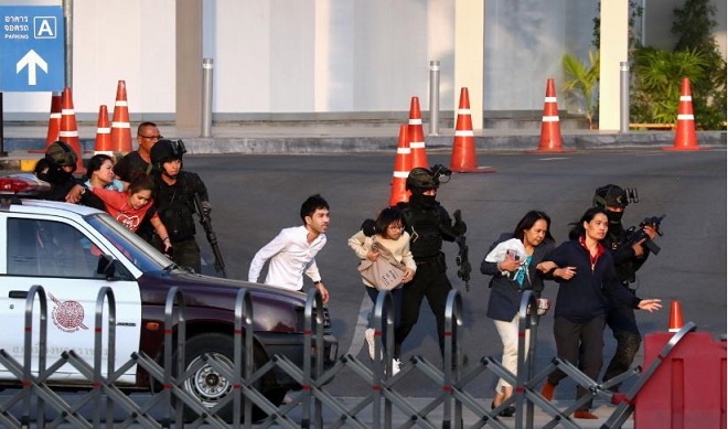 Lực lượng an ninh Thái Lan sơ tán những người bị mắc kẹt bên trong trung tâm mua sắm Terminal 21 sau một vụ xả súng hàng loạt. Ảnh: AP |