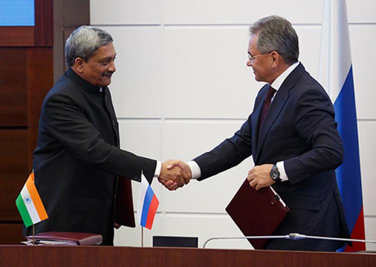 Bộ trưởng Quốc Phòng Ấn Độ Manohar Parrikar (trái) và người đồng cấp Nga Sergei Shoigu. Ảnh: indiatv |