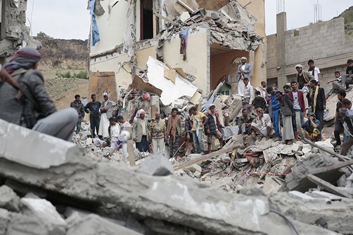 Hiện trường đổ nát của một ngôi nhà do bị trúng bom của liên quân do Arập Xêút dẫn đầu tại Sanaa. Ảnh: RT |