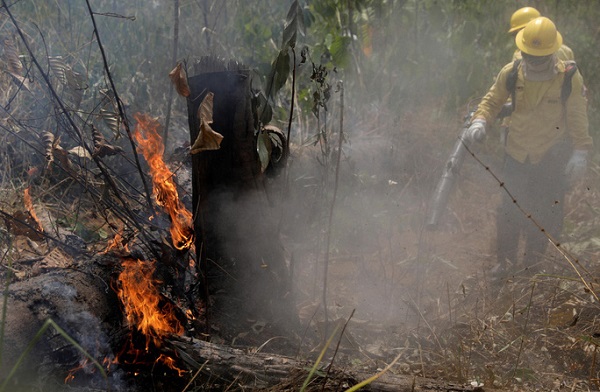 Lính cứu hỏa Brazil nỗ lực dập đám cháy tại khu vực rừng Amazon hôm 25/8 Ảnh: Reuters |
