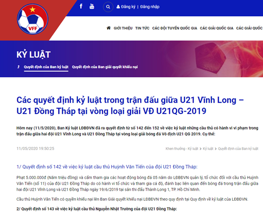 Phạt 5 triệu đồng và 5 năm cấm tham gia các hoạt động bóng đá do VFF quản lý, tổ chức đối với cầu thủ Huỳnh Văn Tiến (số 11) của đội U21 Đồng Tháp do có hành vi tổ chức và tham gia cá độ, đánh bạc liên quan đến bóng đá trong trận đấu giữa hai đội U21 Vĩnh Long và U21 Đồng Tháp ngày 19/6/2019 tại sân thi đấu Thành Long 1, TP. Hồ Chí Minh.