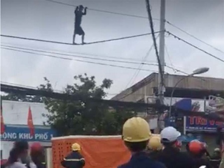 Thanh niên nghi ngáo đá đu mình trên dây điện