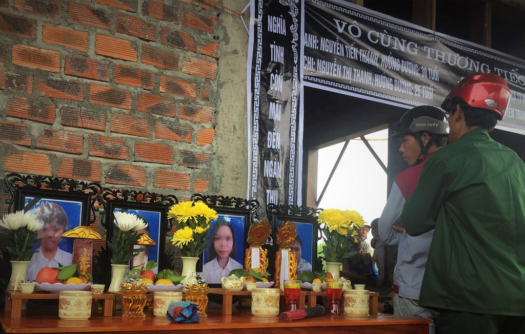Chiếc bàn thờ dựng vội đặt 4 tấm di ảnh nạn nhân. Ảnh: Tri thức Trực tuyến |