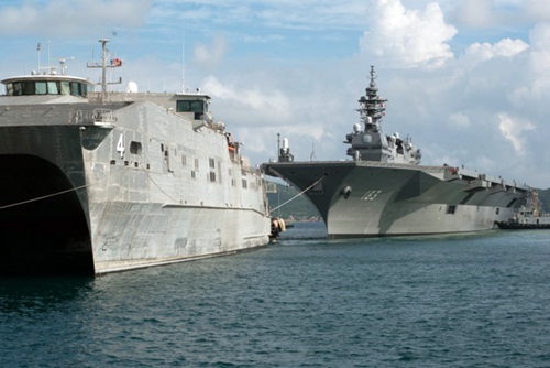 Tàu vận tải viễn chinh cao tốc USNS Fall River của Mỹ và tàu sân bay J.S. Izumo của Nhật Bản cập cảnh Cam Ranh. Ảnh: Đại sứ quán Mỹ tại Hà Nội. |