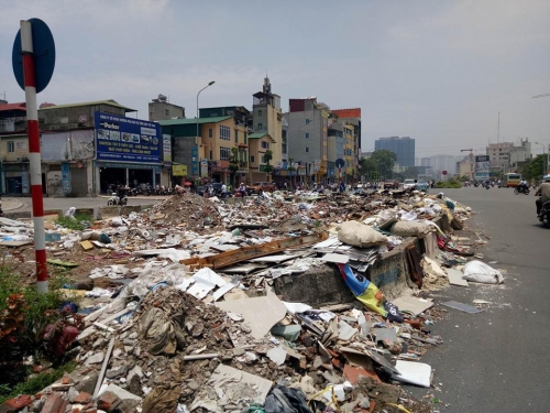Vật liệu xây dựng thừa, cây xanh, rác thải... được tập kết thành đống bốc mùi hôi thối gây ô nhiễm môi trường "tọa lạc" ngay giữa lòng đường Trường Chinh làm mất mỹ quan đô thị.