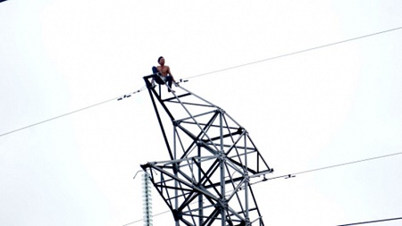 Nam thanh niên cởi trần cố thủ trên cột điện cao thế suốt 6 giờ đồng hồ
