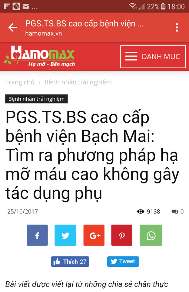 Trong khi đó, trên trang hamomax.vn đã đăng bài với tiêu đề: “PGS.TS.BS cao cấp bệnh viện Bạch Mai: Tìm ra phương pháp hạ mỡ máu cao không gây tác dụng phụ”. Nội dung bài viết là “những chia sẻ chân thực nhất của PGS.TS.BS. Đ.Q.H – Chuyên khoa Tim mạch (Công tác tại viện Tim mạch Quốc gia, hiện công tác tại bệnh viện Bạch Mai) trong điều trị mỡ máu cao cho rất nhiều bệnh nhân và của chính bản thân mình”.