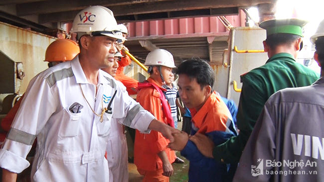 Các thuyền viên được lực lượng cứu hộ đón lên bờ. Ảnh: báo Nghệ An |