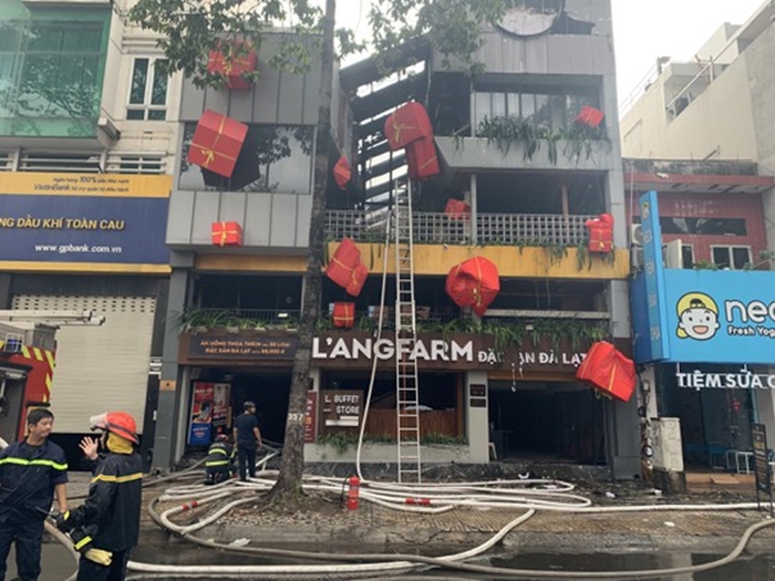 Khoảng 10h30 ngày 1/1, ngọn lửa bất ngờ bùng phát dữ dội ở tầng 4 của cửa hàng L'angfarm Buffet - chuyên bán các loại ‘đặc sản' Đà Lạt nằm trên đường Trần Hưng Đạo (phường 1, quận 5, TP.HCM).