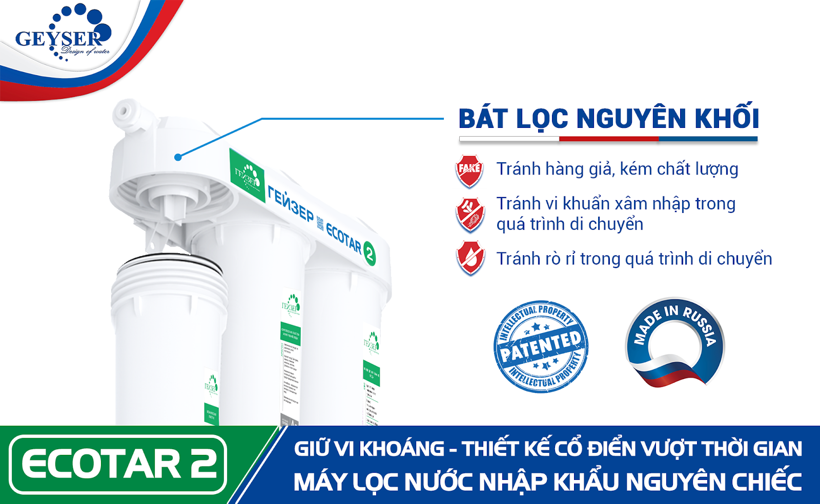 Sử dụng bát lọc nguyên khối là một điểm khác biệt của Geyser Ecotar 2 với các sản phẩm khác và mang lại nhiều lợi ích cho người sử dụng như: tránh hàng giả, hàng nhái; tránh rò rỉ trong quá trình di chuyển; ngăn chặn vi khuẩn xâm nhập trong quá trình phân phối, lưu trữ.